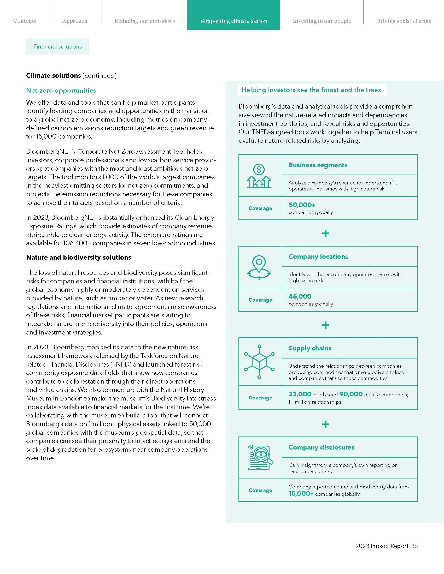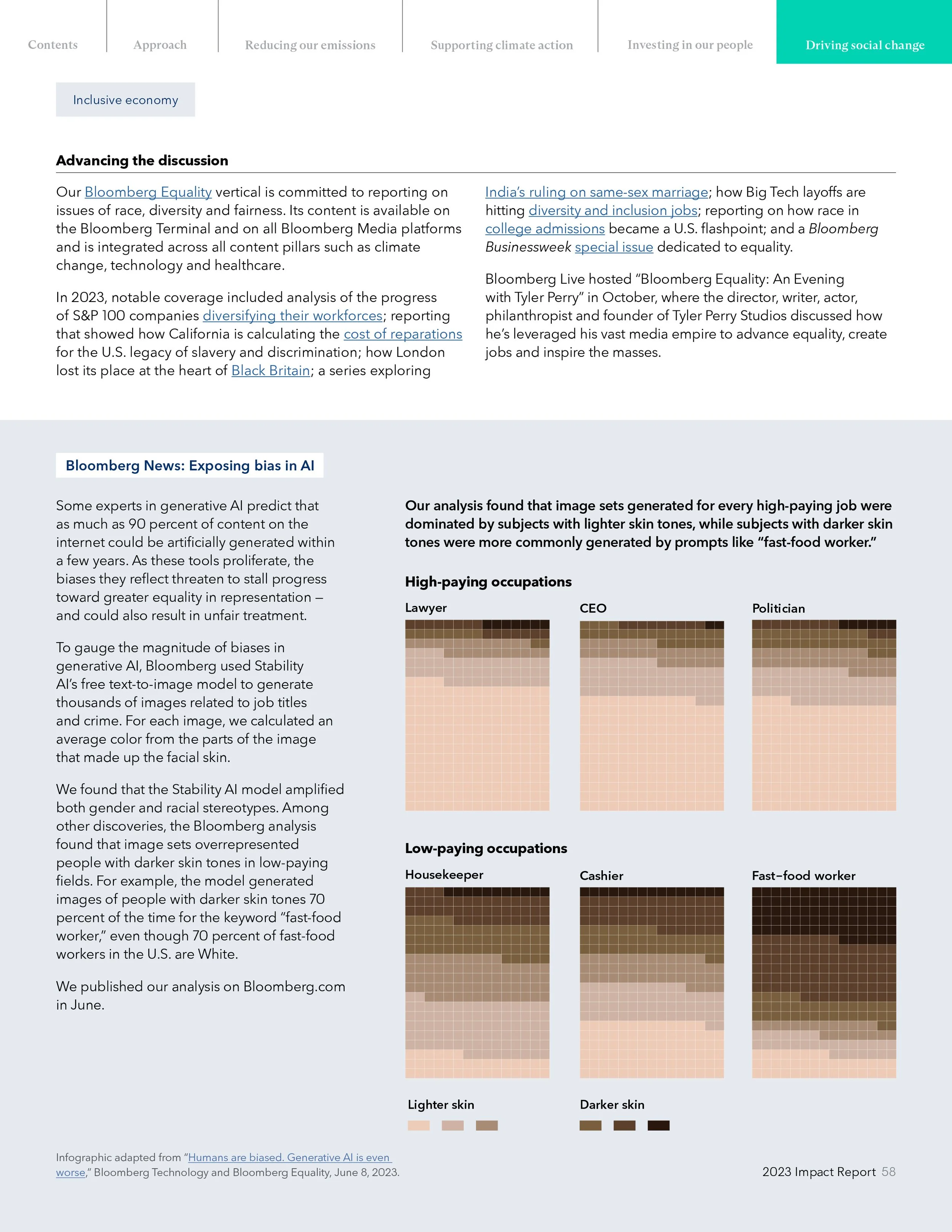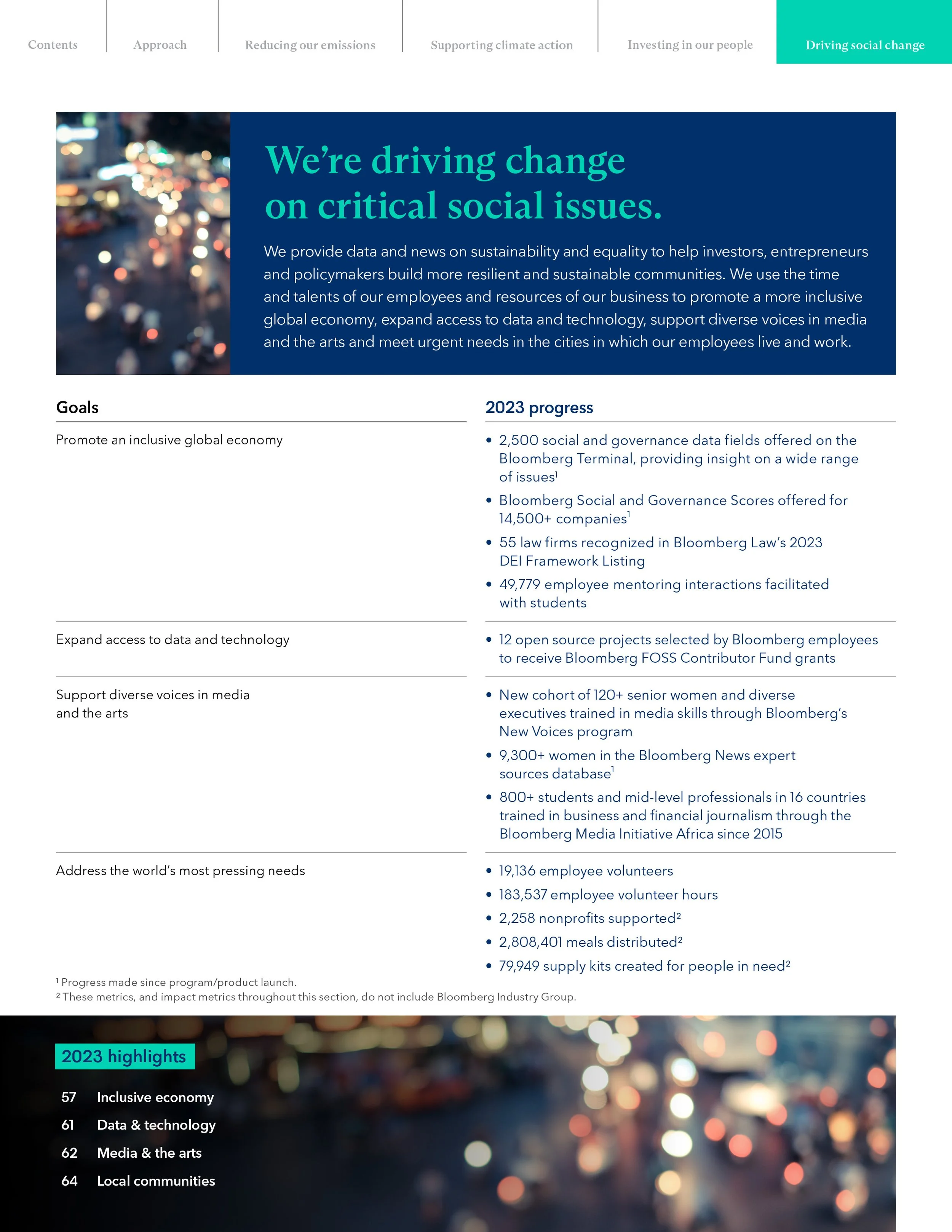 I was Senior Editorial Designer for the 2023 Bloomberg LP Impact Report. It was a 4 month project, and I was responsible for design and production of the report. The report was 70 pages long and was made in InDesign. I worked with a number of different stakeholders to lay out the report which included photos, copy, illustrations, tables, charts, infographics and a hyperlink navigation system.